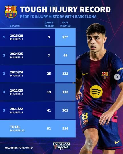 2025-26赛季(截止2025年10月30日),佩德里受伤1次,共缺席3场比赛,休战25天。